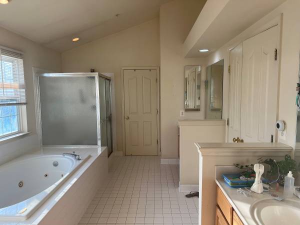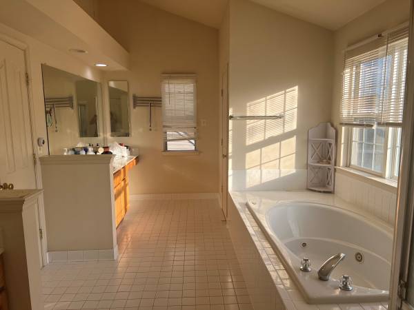 Upstairs, all four bedrooms offer generous space, custom closets, and ceiling fans. The fully renovated bathrooms include a stunning primary suite with a sitting area, double vanity, a floating soaking tub, and a separate shower, creating a serene retreat.