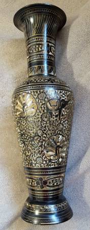 This was purchased in India in the 80's. There are some surface blemishes due to age and some were probably there when purchased. See photos. It was kept in a curio cabinet for display purposes. Approximately 11.5 inches tall and 3.5 inches wide across the top of the vase. This is a charming distinctive piece with its ornate peacocks, flowers, elephants, etc., that could make a nice addition to your home décor.