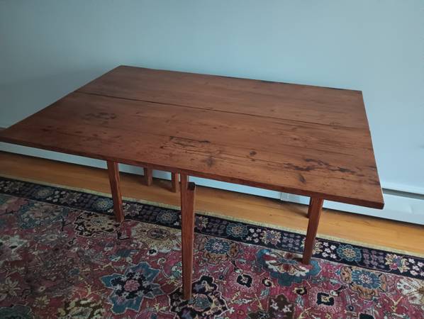 Antique Pine Drop-leaf Table in excellent condition; crafted with no screws or nails: 47" wide, 28" high, each leaf is 17" wide; w/ both leafs down 17" deep; overall length when fully open 51": $550