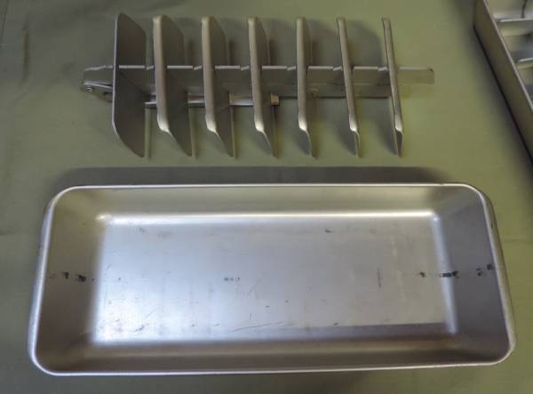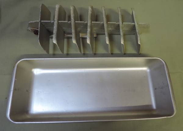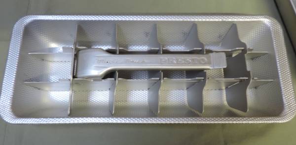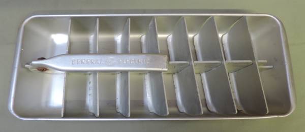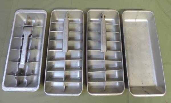vintage, mid-century aluminum ice cube tray lot (x3) used and with signs of age and handling, but in overall good condition one Presto and two General Electric