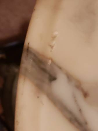 Beautiful antique Conmar made in Italy marble pedestal side table. Stand is marble base and metal (possibly brass or molded metal). Heavy. Thick marble top and base. Solid marble top, no cracks or stains. 18 inches across top. And it is 2 feet tall. Some small chips (about 10) in the outer rim, see pictures.