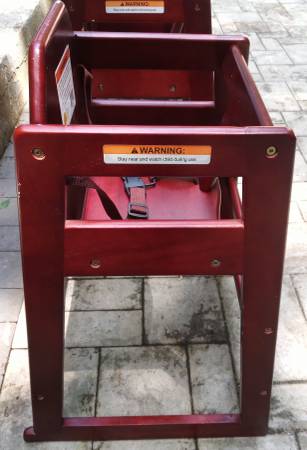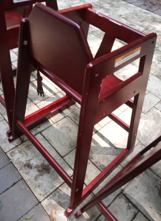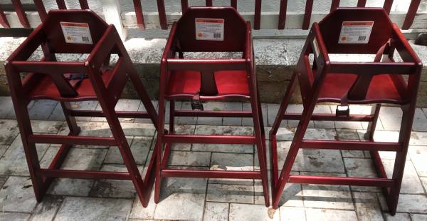 set of three stackable restaurant style high chairs wood with Mahogany finish used and with some minor signs of wear but in overall good condition 25.00 for all three or 10.00 ea