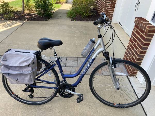 Trek 7100- 21 speed bicycle with attached bag. Aluminum step-thru frame with Shimano derailer and quick release wheels. Cables and brake pads replaced this past year. A nice unisex bike at a great...