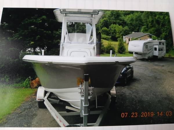 Tidewater center console, T-top, Bimini top in front of T-top, trim tabs, underwater lighting, deck lighting, ship to shore radio, regular radio, compass, gremlin fish finder, life preservers, all trolling rods and fishing gear, plus trailer and new tire. Light bar in front of T-top and new batteries. Live well, cooler, storage spaces under seats. Well-maintained motor. Quick release life preserver holder under T-top. Hull is gray and white. Side and front skirts to keep you dry around T-top.