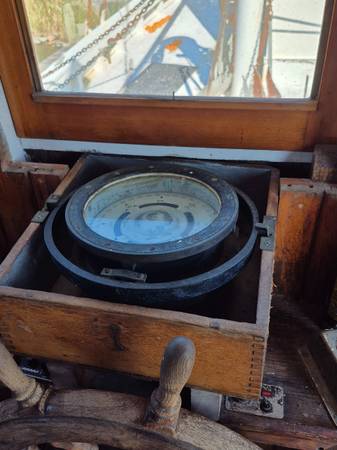 Last haul out was in May 2022 at Walden Brothers in Deltaville where new zincs, aluminum oxide galvanization barrier coat placed on below water metal, bottom paint, packing repacked. Hull is 2 5/8 inch fir over oak beams. No hull re-caulking was needed as the boat is tight and has slow water intrusion. Bilge pump only occasionally comes on. Topsides painted but as can be seen some rust bleed through has occurred at some ferrous fittings. Equipped with a chain driven auto pilot. Diesel oil and fuel filters changed in the spring.