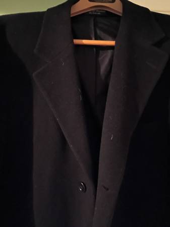 Men's black cashmere blend overcoat. Very good condition, no stains, tears, what-not. Very warm. I'm 5'8", around 160 - fits over a suit well; a bit loose without the suit jacket.
