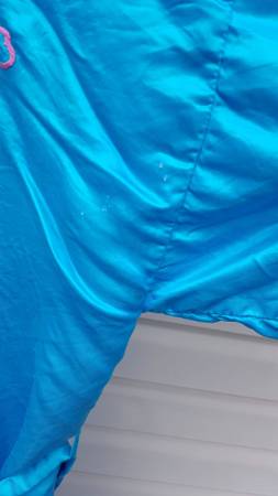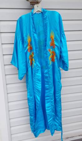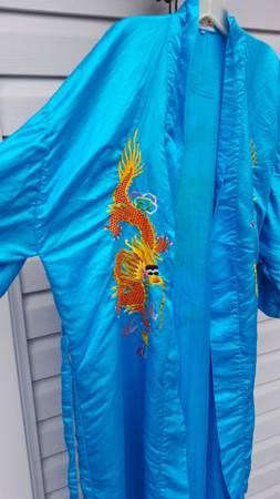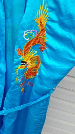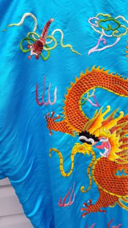 Golden Bee Chinese Dragon Kimono Robe with sash/belt - This was barely worn. It is approximately 49-inches long from the shoulder to the hem and is a size large. This has been washed, but needs to be steamed to get out the wrinkles. It was difficult to get a good photo of this due to the way it hangs on the hanger. There are a couple of very negligible abrasions in the fabric on the back by the right arm. (See photos.) I did not notice any other issues with the robe or the embroidered Chinese dragon designs. I've seen a very similar robe with less detail on the back selling on Etsy for $99. This could make a nice gift for someone into Asian themed items or for use as part of a Halloween costume.