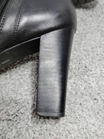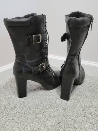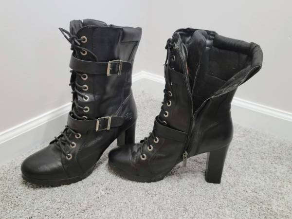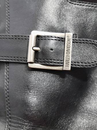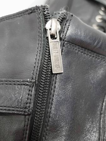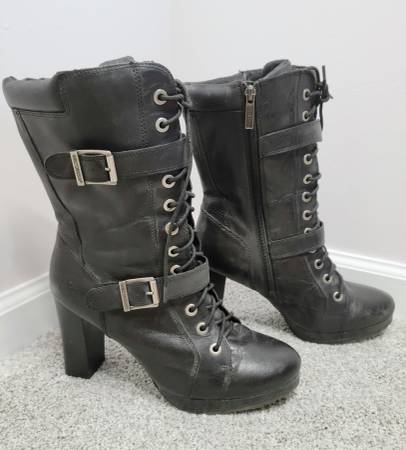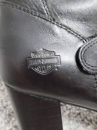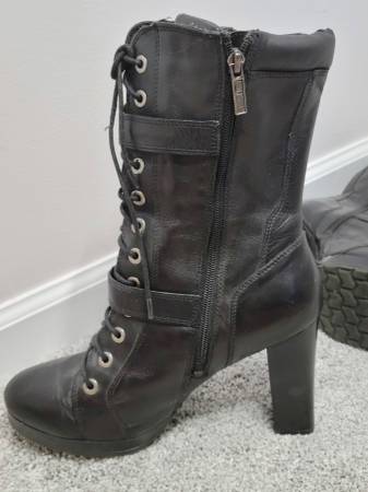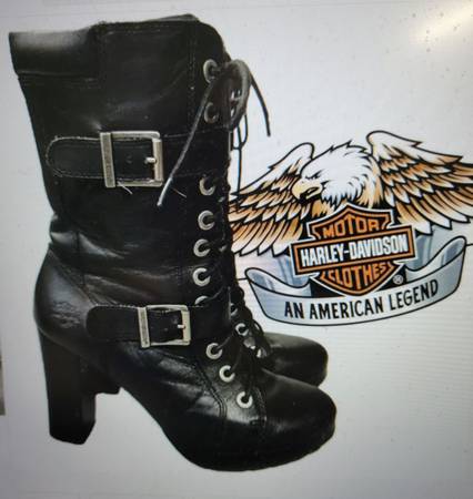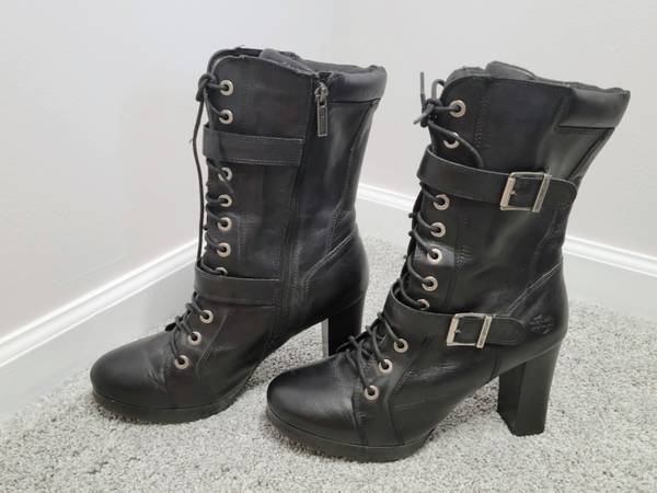 These super cute boots need to go to a new owner who will show them off as they deserve. My days of wearing such boots have passed. Details: 4-inch chunky stacked block heel; black genuine full grain leather upper; full length side zipper with lace up front to ensure proper fit; buckle accents. Cushioned footbed make these boots surprisingly comfortable. I paid approximately $160 several years ago. Excellent pre-owned condition (minimal marring). See photos for further description/condition. (Note: The 2 photos with the white background and/or the Harley-Davidson Emblem Logo are not my photos and are representational photos only.)