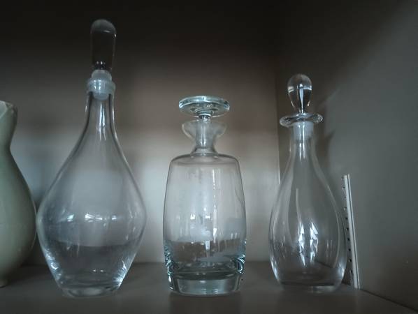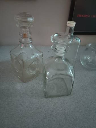 Glass Decanturs in variety of shapes, all in excellent condition $55 each Etched Glass Ship Decantur w/ 4 matching Old-fashioned Glasses, new condition: $65 Located in Annapolis, but could meet...