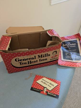 Circa 1946 General Mills iron. Perfect working condition, hardly used. Original box and instructional manual for the "new homemaker".
