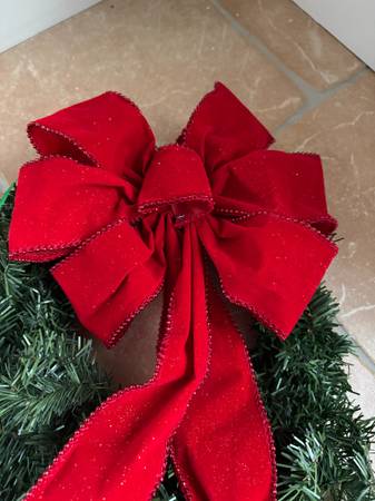 12" Festive green Christmas wreath with a large red bow.