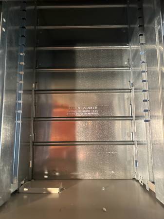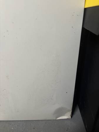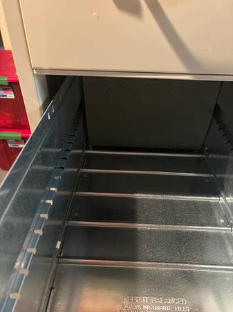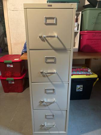 Vertical tan 4 drawer metal filing cabinet with high side walls for hanging files. Thumb latches on each drawer to prevent accidental opening. Used but good condition.