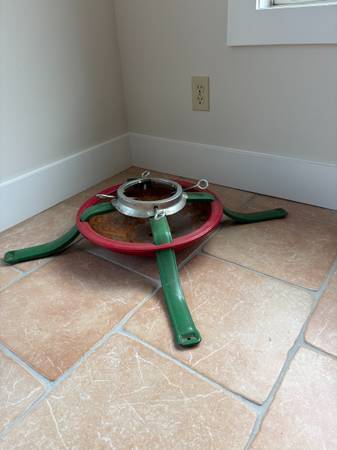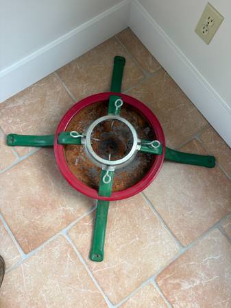 Sturdy metal stand with green and red design. Large live Christmas Tree Stand Measures 34" wide and can accept a 6" diameter trunk