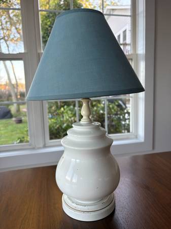 White Enamel Painted Table Lamp with 4" x 10" x 7" Blue Lampshade