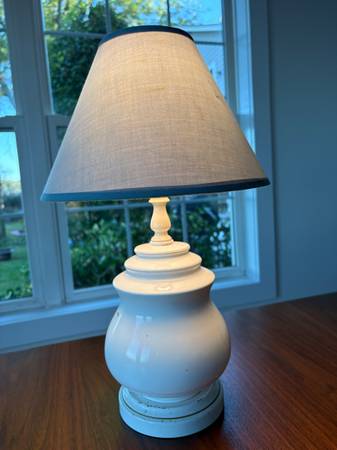 Illuminate your space with this sleek and stylish table lamp. Crafted from durable metal, this lamp features a clean white enamel finish that complements any decor style. The lamp is corded electric and measures 17 inches in height with a 4" x 10" x 7" blue lampshade that adds a pop of color to your space. Perfect for collectors or anyone looking to add a touch of sophistication to their home or office, this white enamel painted table lamp is a must-have. The lamp can be used in a variety of settings, from a cozy reading nook to a stylish living room. Get ready to brighten up your space with this elegant and functional table lamp.