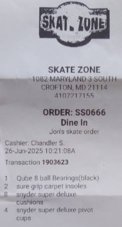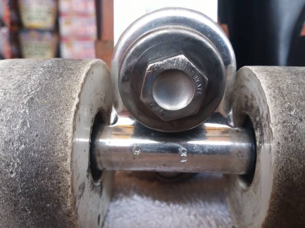 - Axles in good condition but kneuralls (sp?) worn, so axles will readily comes out of truck housing (hangar) when replacing wheels. Kneuralls (sp?) are "rings" inside the hangar that the axle is tightly pressed into during production to keep them in place. I was informed not a big deal and does not affect performance. I've put a pic of receipt with Skate Zone's number. (I'm sure Chandler would be able to explain the work rendered to these skates and nature of kneuralls (sp?) better than I.)