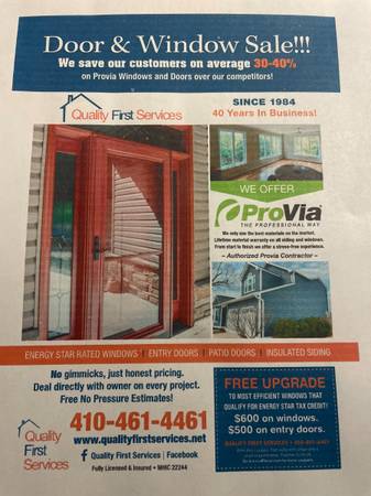 Are you looking to replace your Windows Doors or Siding? Provia Door and Window Sale! Before you pay those High pricing for Provia Doors Windows and Siding, give me a call! We offer the best pricing on Provia Entry Doors, Windows, we also offer the best pricing on Insulated Siding, Gutters and Trim. Don't overpay, give me a call Today! Over 38 years in business Local Ellicott City Contractor! After you sit through a 3-hour high pressure sales pitch. Call me and see how much more you get with Quality First Services. Always Free no pressure estimates show contact info