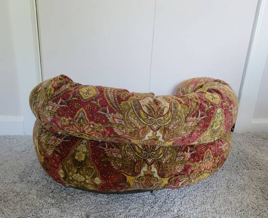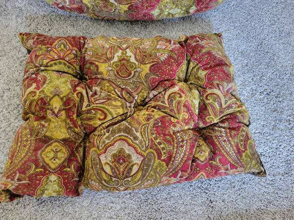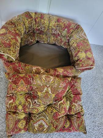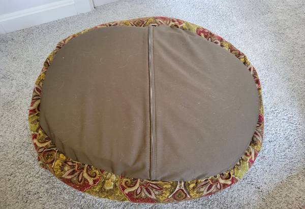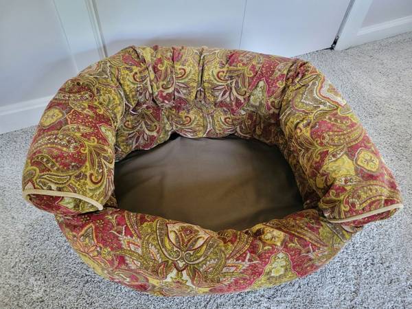 Double donut bed, low pile microvelvet durable upholstery grade fabric, removable tufted cushion and foam bottom insert. Removable cover can be machine washed (cold/gentle)/dry - low. For dogs (or cats) up to 25 lbs. I washed the cover even though this was barely used. See photos for further description. 27-in L x 22-in W x 14-in H. Smoke free/flea free home.