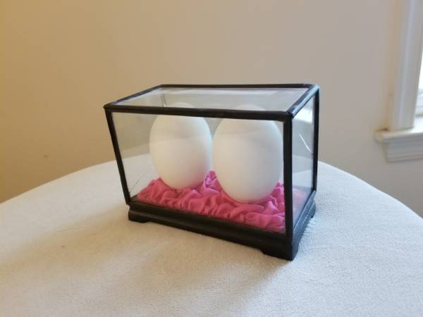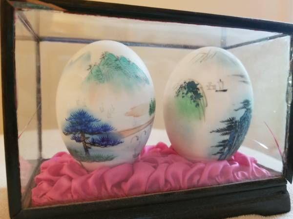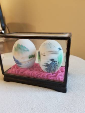 Hollowed eggshells painted with Chinese mountain scenes. In a small glass case with minor frame damage, 6"x 4"x 2.5". FRAGILE! Group my posts together for a discount!