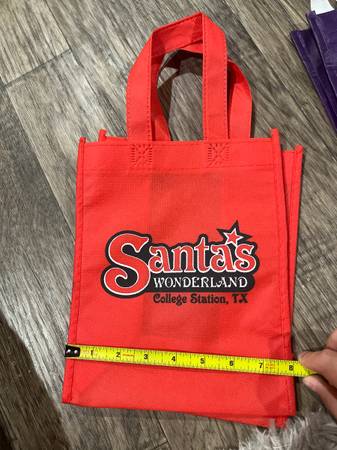 Don't miss out on these fantastic, durable reusable tote bags! Perfect for carrying groceries, gifts, or promotional materials, these lightweight bags are an excellent way to reduce plastic waste while showcasing a fun brand identity. The collection includes a vibrant red bag featuring the festive logo for Santa's Wonderland College Station, TX, instantly recognizable and great for holiday events or local pride. Additionally, there is a sleek, professional purple bag ideal for beauty supplies or a stylish day out. Both bags feature sturdy handles and a convenient, foldable design, making them a must-have for any shopper, event organizer, or business looking for effective, portable branding. Grab them now and carry your goods in sustainable style!