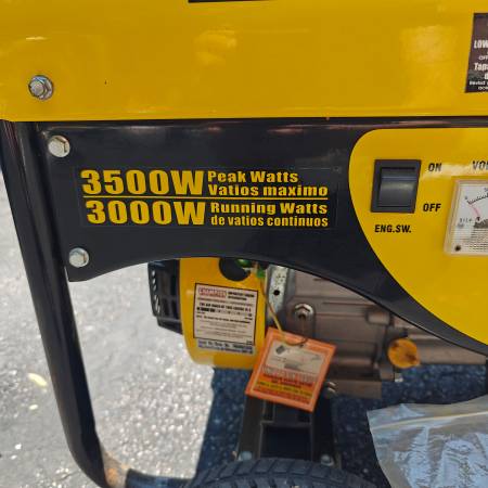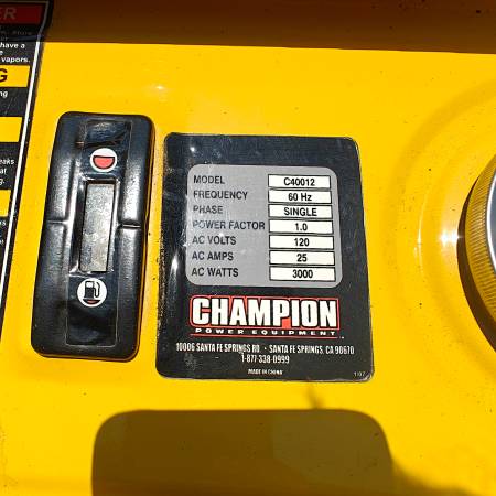 Model: C40012 Peak/Running Watts: 3500, 3000 GASOLINE ONLY! AC Load: 120 volts AC Amps: 25 Single Phase, 60 Hz 22” x 24.4” x 31.7” 120 lbs. 4 Gallon (15 Liter) tank 6.5 Horsepower