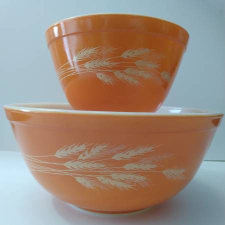 $25 1.5 pint and 2.5q mixing bowl set, wheat on orange "Autumn Harvest Wheat 401 & 403"