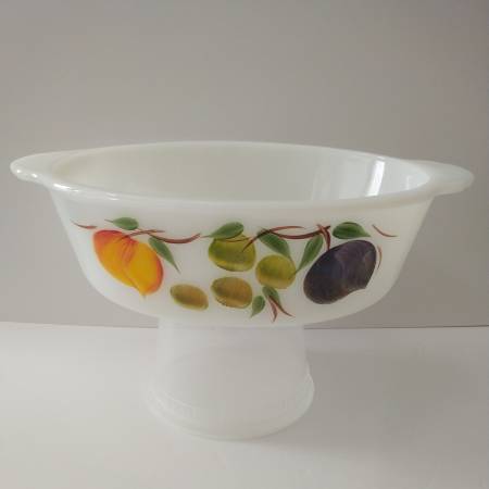 $10 1.5q Fire King oval casserole with scalloped handles "Gay Fad Fruit"