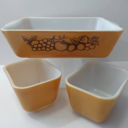$35 Set of 3 refrigerator dishes no lids, fruit and caramel brown "Old Orchard 501(x2) & 503"