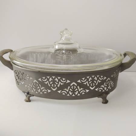 $15 2qt clear oval casserole with lid and decorative metal holder - true antique, back stamp circa 1919 - early 20's