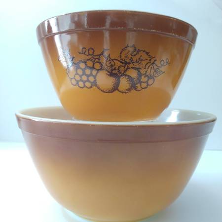 $20 1.5 pint and 1.5q mixing bowl set, fruit and caramel brown "Old Orchard 401 & 402"