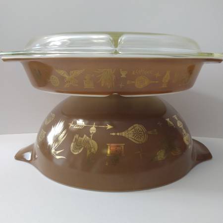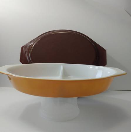 $15 1.5qt oval divided dish with lid, gold on brown "Early American"
