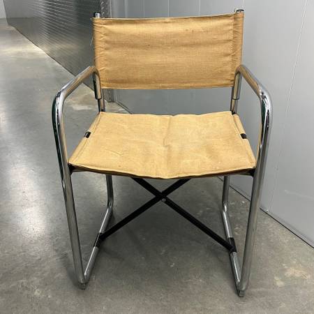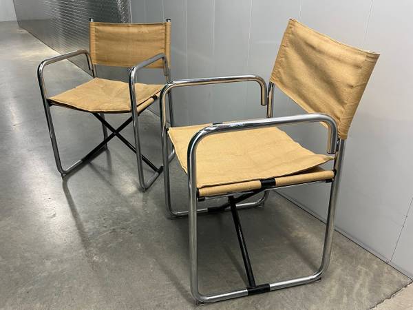 1970s: One pair of Architect-owned vintage Modern chrome + canvas Chairs. $40 for one, $75 for both chairs. They fold for convenient storage - open them when you have guests, or keep them open + on display. Condition: the canvas is yellowed but could be rejuvenated. These MCM chairs are 55 years young!