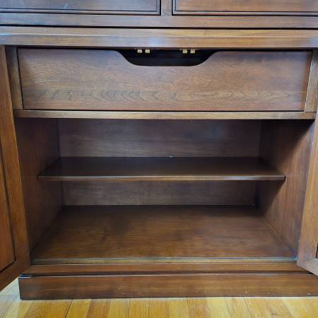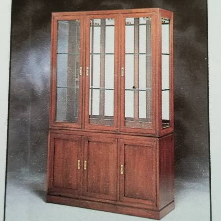 Gorgeous vintage Ethan Allen Canova display cabinet —in solid cherry wood with timeless campaign-style details.