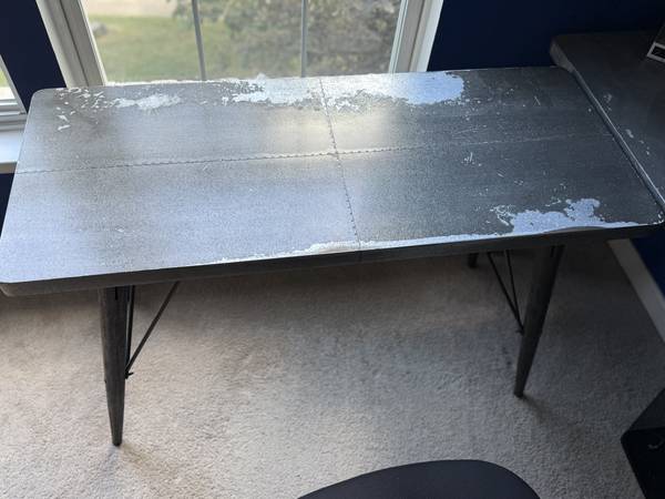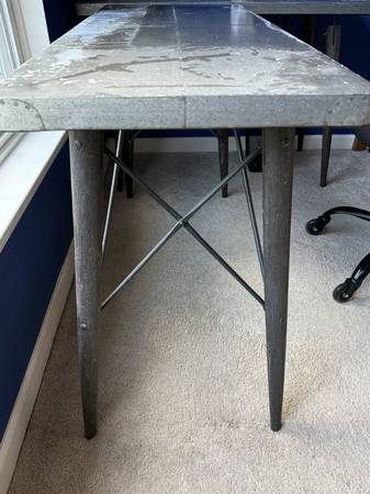Tabletops are wrapped in antiqued sheet metal, some parts are worn and the finish can be removed or fixed. Wood has been sustainably harvested and features a sandblasted finish. Legs and metal...