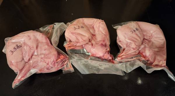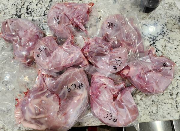Frozen or fresh-cut rabbit/bunny meat, vacuum sealed. We raise the bunnies.