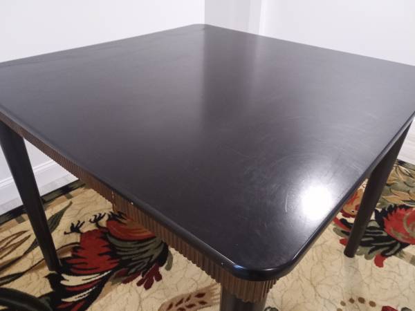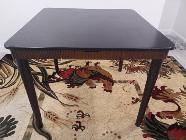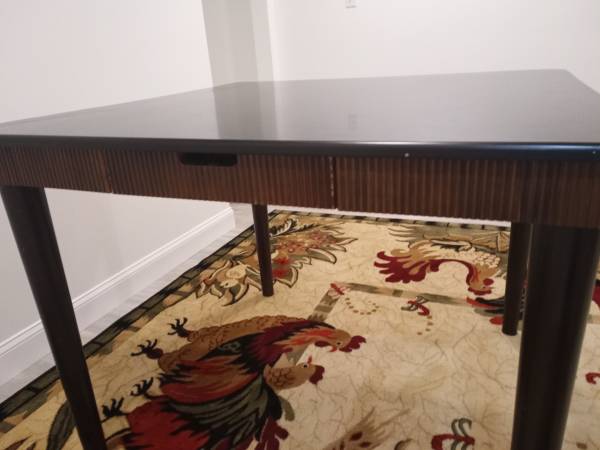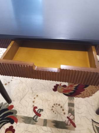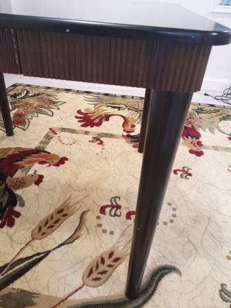 flawed along one edge - water damage, but otherwise in good condition. legs unscrew four drawers - one on each side