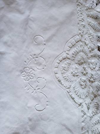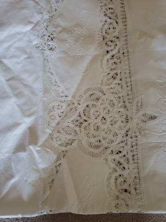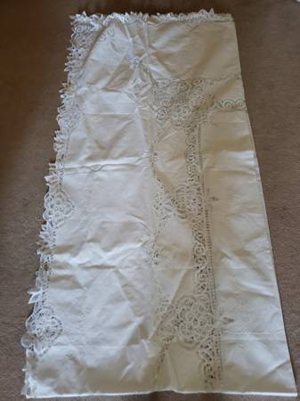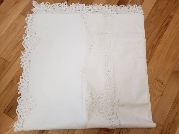 NEW Beautiful white cotton/linen with embroidery design "wedding" table cloth and matching napkins set. 24 napkins. Never used, from a smoke free home. This set is exquisite with unique embroidery and lace details.