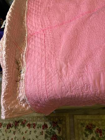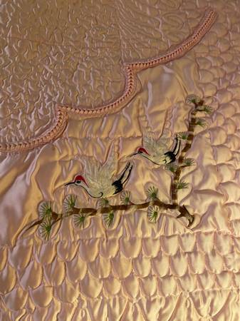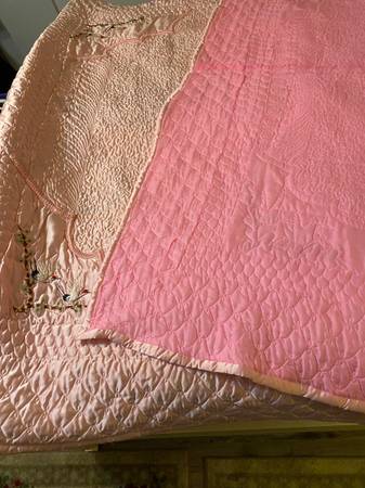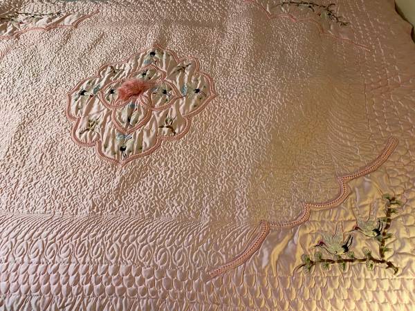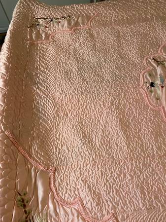 VIVID PINK COLOR. Perfect condition . Intricate DESIGNS , birds etc. COVERS a KINGSIZE bed. . Very satiny fabric. 🌸 never used .