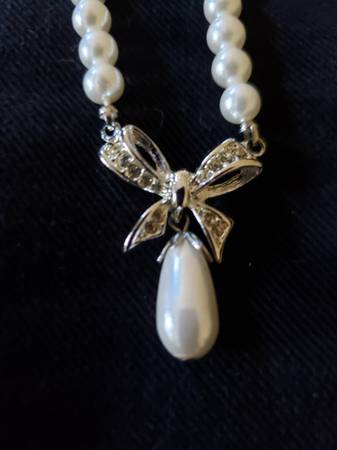 Beautiful set of earrings and necklace of faux pearls and rhinestones. Never worn. Beautiful bow features. $50 Cash Located in Deale, MD