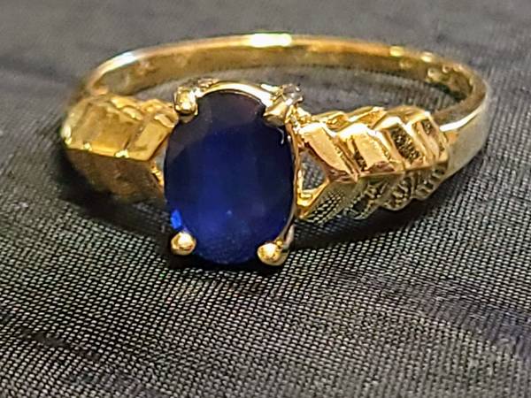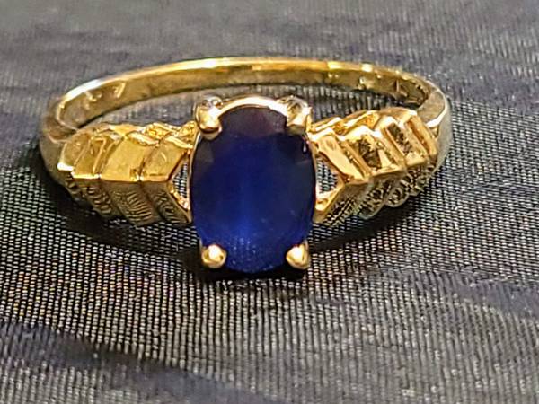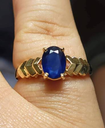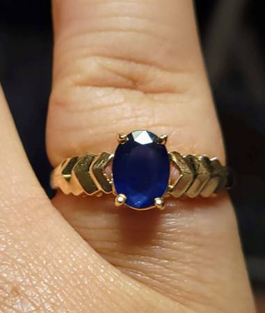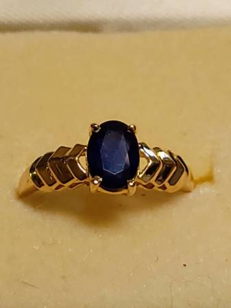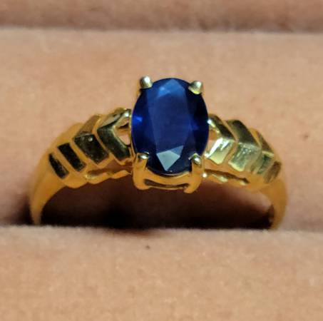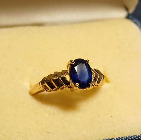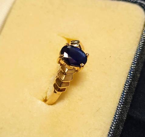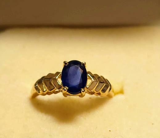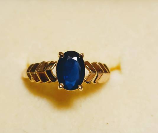 Natural oval faceted cut sapphire in a 14K yellow gold ribbed step ring mounting; total ring weight = 2.36 grams. The sapphire measures 8mm x 6 mm. The 14K stamp on the ring has worn away and is hard to distinguish; however, the appraisal reflects that it is 14K yellow gold (see photo). This was not created in a lab, and is in pre-owned/pre-loved condition. See photos for condition and further description.