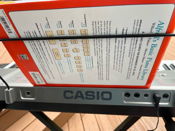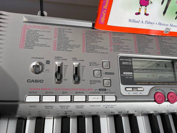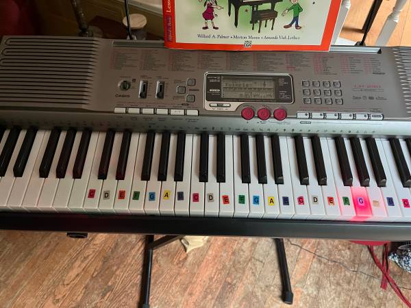 LX-230. 61 Keys lights up to allow new or experienced players to follow along with finger placements. Hundreds of preprogrammed songs. Built in speakers. Comes with adjustable stand, Beginner player book, and AC cord. Has inputs for external microphone (not included) Audio In, Headphone output and USB.