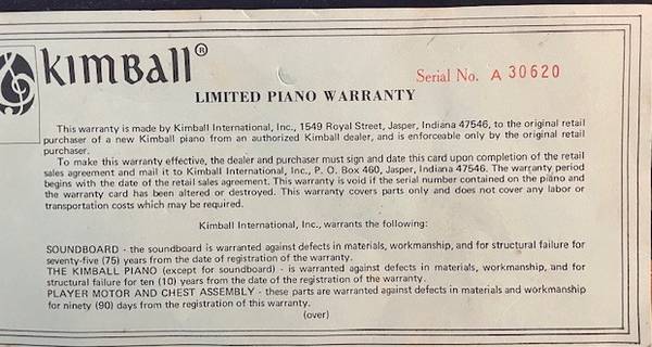 Kimball Upright piano and bench, in very good condition. Serial Number A30620. Manufacture date, 1982. Buyer pays for pick up and delivery