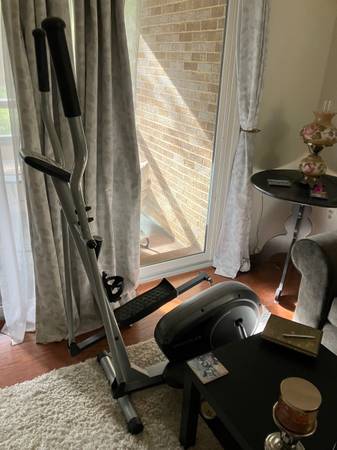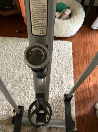 This elliptical has all basic functions (see photos) and is light and easy to move around. It works great, but does need a new battery. It’s approx 61in from the top of the handle to the bottom of the machine and 34in across. Sadly, I need to rearrange my space so can no longer keep it.