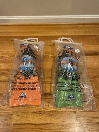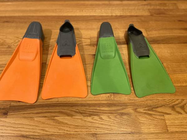 Great used condition. Barely used. Like New. Two pairs of kids swim flippers for sale. $10 per pair. You can just buy one or both pairs. Green pair is US size 1-3. Orange pair is US size 3-5.