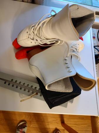 Bought new, used only 3 times. Padded tongue, real leather, felt insole, includes guards, covers, and knee pads.