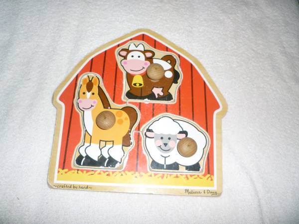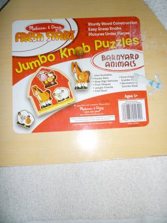 Like New Melissa and Doug Wooden Puzzles and Toys: Melissa and Doug Fresh Start, Wood Jumbo Knob Puzzle, Barnyard Animals, Age 1+, $5. New, ABC Form Capital Letters Puzzle, $5. New. abc Foam lower...