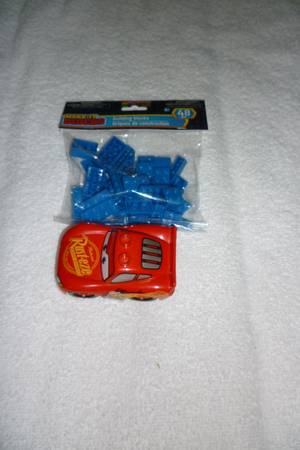 New, Red Lego Lightning McQueen Rust-Eze Car, $10. with New 3 Bags of Legos and extra Car's Blue Car. Three Different colors of Legos.