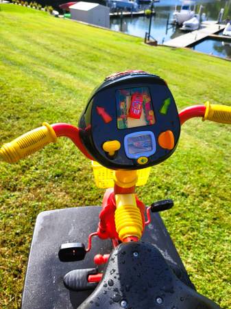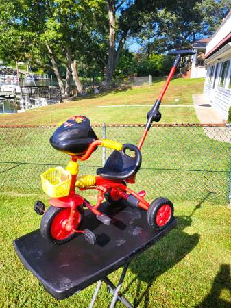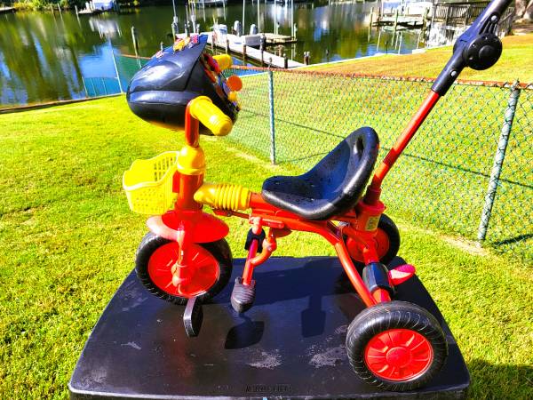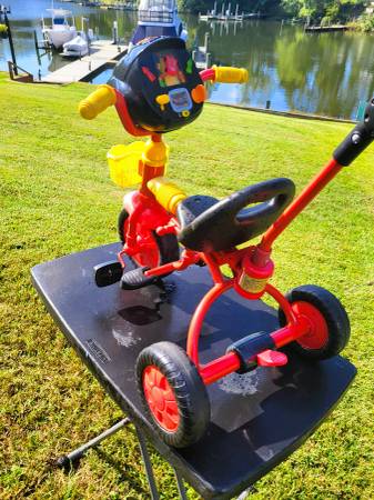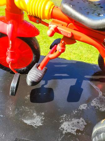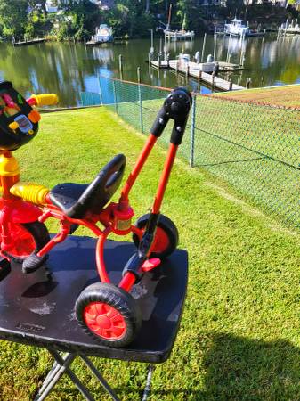Push or fold foot pegs back for the child to peddle and steer it them selves