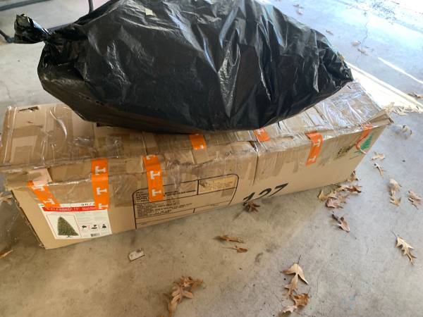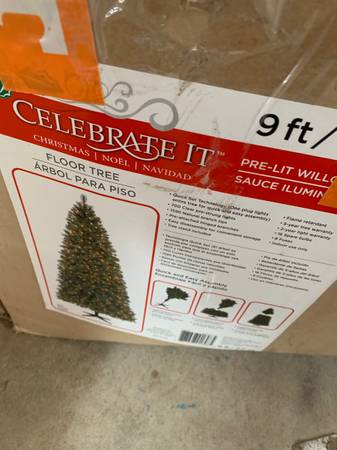 9' ft artificial tree. One strand of lights isn't working, but they can probably be fixed, or else just add new lights over the entire tree. Sheds a bit. But is in generally good shape. Could go...