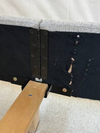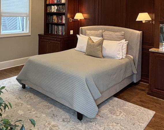 Queen bed and box spring. Smoke-free home. One of the side boards is broken but still fully functional. See photo.